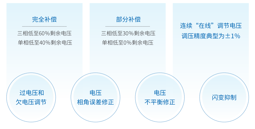 電壓暫降補償、電壓暫升補償、相角誤差修正、電壓不平衡修正、連續在線調壓、電壓波動與閃變